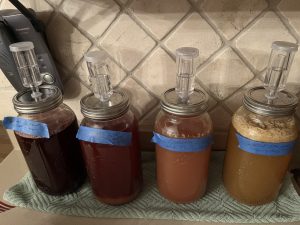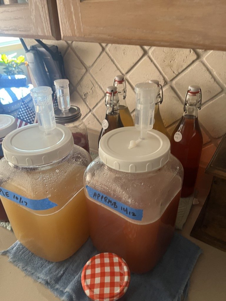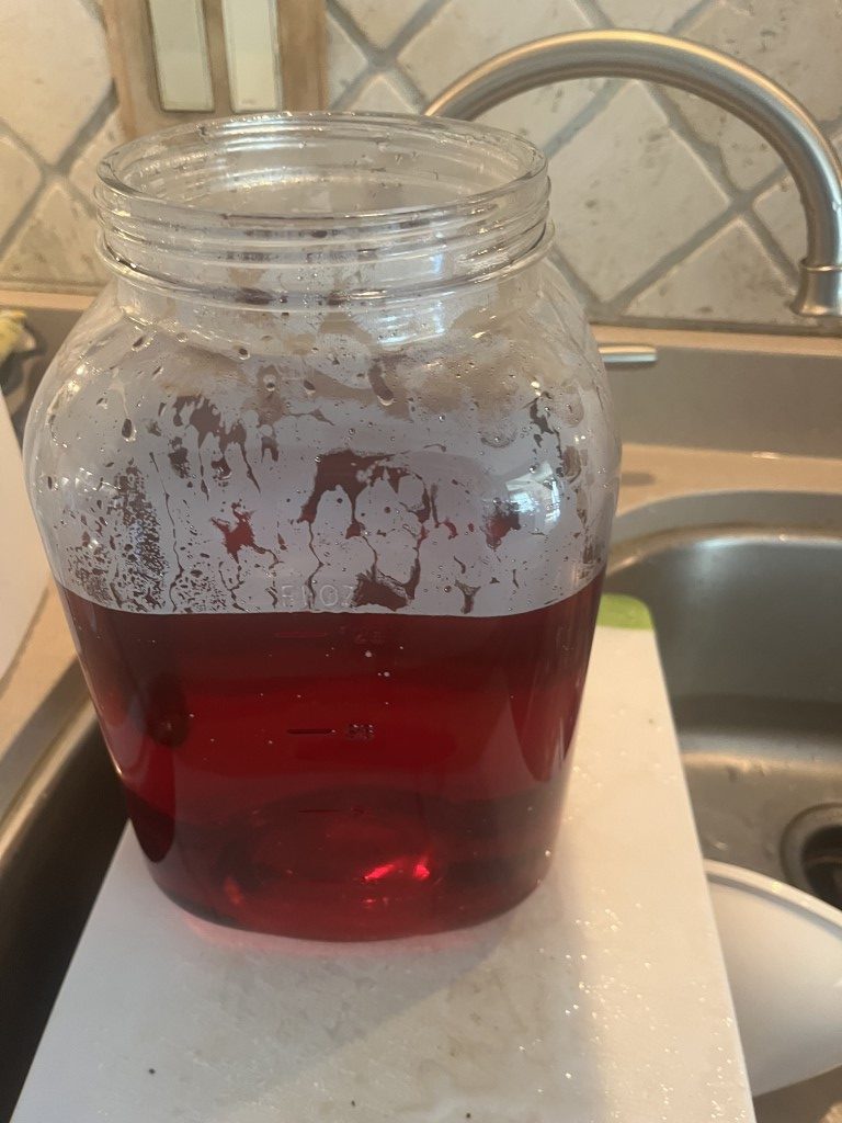 ~~~ 2024-10-15 uice: 348g of sugar...added 1/2tsp yeast nutrient, foamed up, thankfully using new 1.5gal jars... it calmed down and still brewing...